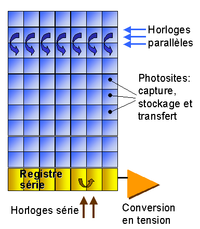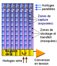 - Le CCD «à transfert de trame» (full-frame transfer) : il associe deux matrices CCD de même dimension, l'une exposée à la lumière, l'autre masquée. On peut ainsi procéder à un transfert rapide de la matrice d'exposition vers la matrice de stockage puis à la numérisation de celle-ci en parallèle avec l'acquisition d'une nouvelle image.