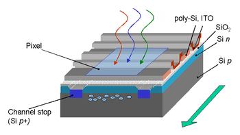 - les électrodes (grilles) en silicium polycristallin circulent au-dessus de la couche photosensible et absorbent une part importante de la partie bleue du spectre (0, 35-0, 45 micromètre) ;