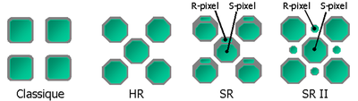 - puis (encore Fujifilm, 2004) les photosites sont dédoublés en un élément de grande taille «S» et un élément plus petit «R» qui étend la dynamique vers les hautes lumières (de 2 bits) en deux générations successives, SR et SR II ;