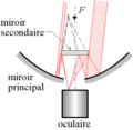 Les télescopes utilisent des miroirs paraboliques ou sphériques pour focaliser la lumière provenant des astres. Comme le plan focal se trouve devant le miroir focalisateur, par conséquent sur le trajet des rayons arrivant, les rayons réfléchis sont déviés par un autre miroir, ce qui permet d'avoir une image du plan focal du premier miroir. Cette image du plan focal est observée grâce à un système optique nommé oculaire.