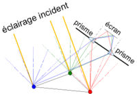 Une des méthodes pour décomposer la lumière consiste à la faire diffracter sur un réseau optique plan (c'est ce phénomène qui donne les irisations sur un disque compact). Un réseau plan consiste en de nombreuses lignes parallèles espacées uniformément, chaque ligne diffusant la lumière dans l'ensemble des directions (contrairement au miroir qui ne réfléchit un rayon donné que dans une seule direction). Les interférences à l'infini (c'est-à-dire loin du réseau) font que seules certaines couleurs ressortent dans certaines directions. Ceci permet d'analyser le spectre de la lumière : on regarde l'intensité de la lumière dans telle ou telle direction, on sait que chaque direction correspond à une longueur d'onde donnée. Surtout, cela sert à caractériser certains phénomènes qui émettent de la lumière. A titre d'exemple, le spectre d'une étincelle faite sur un matériau est caractéristique de la composition chimique du matériau.
