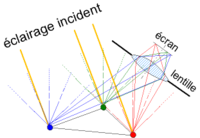 Donc, si on met un écran sur le plan focal d'une lentille ou d'un miroir courbe, chaque tache correspondra à la lumière captée venant d'une même direction par conséquent venant d'un même objet (ou d'objets alignés). Plutôt que de mettre un écran, on met généralement un miroir, qui prend moins de place et sert à rallonger le trajet optique, par conséquent l'agrandissement de l'image. Plus l'ouverture de l'instrument d'optique est grand, plus on collectera de lumière, plus l'intensité sera importante, mais plus on s'éloignera des conditions de Gauss, moins la focalisation sera idéale (image floue).