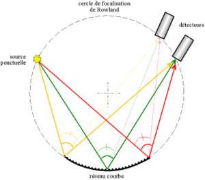 On a par conséquent focalisé les rayons. Le cercle de focalisation (celui sur lequel se trouvent le réseau, la source et le détecteur) se nomme le cercle de Rowland.