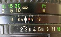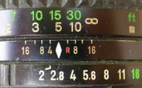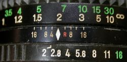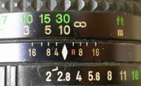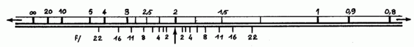 De part et d'autre du losange qui sert de repère pour les échelles de distance et de diaphragme, on voit des traits symétriques portant des valeurs de diaphragme, 4, 8 et 16. En tournant la bague de mise au point de façon que les repères 1, 5 m et 3 m deviennent symétriques comparé au losange, comme par miracle, on fait la mise au point sur ... 2 m. De plus, nos deux repères se trouvent quelque part entre les graduations d'ouverture 11 (nombre non gravé) et 16. Avec 12, 5, notre calcul n'est apparemment pas si mauvais. Nous expliquerons plus loin ce petit «miracle».