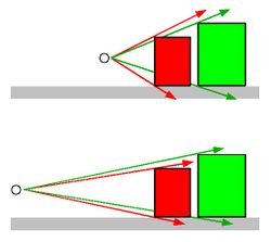 Si on veut qu'une photographie restitue aussi totalement que envisageable la réalité, il faut l'examiner sous un angle semblable à celui sous lequel le sujet était vu lors du déclenchement. Le tonnelet rouge a l'air légèrement bizarre sur la photo A, qui retrouverait un aspect naturel si on l'examinait depuis une distance légèrement inférieure à sa largeur, soit à peu près 9 cm sur un écran de 19 pouces. Il y a une justice pour les myopes. Pour avoir l'air naturelle, la photo B devrait être regardée d'une distance identique à à peu près deux fois sa diagonale, à peu près 25 cm sur le même écran. De particulièrement près, elle prend bien entendu un allure bizarre et de particulièrement loin, elle donne l'impression que les deux tonnelets sont semblables mais posés à des hauteurs différentes.