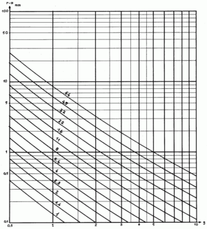 Ces formules montrent que la distance de mise au point p, les deux distances a et r et l'hyperfocale h peuvent être représentées particulièrement aisément sur la même échelle. Il est par conséquent envisageable d'utiliser directement les valeurs de l'hyperfocale, pour les différents diaphragmes, de part et d'autre du repère de mise au point. La limite de netteté admise par la majorité des constructeurs est de l'ordre de 1/1500 ou quelquefois de 1/2000.