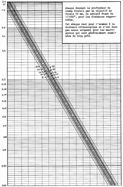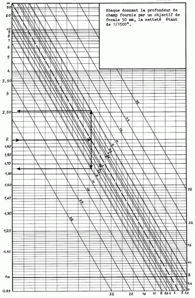 On lit 5 m à 16, 10 m à 8 et , en prolongeant la série, on déduit 20 m à 4 ou 40 m à 2, ouverture maximale de cet objectif.