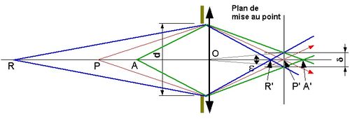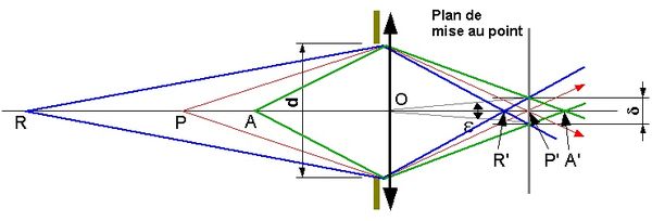 La portion de l'espace comprise entre les deux plans perpendiculaires à l'axe optique qui passent par A et R sera susceptible d'apporter une image nette compte tenu des critères adoptés pour le calcul. L'espace qui sépare ces deux plans correspond à la profondeur de champ. Cette profondeur fluctue beaucoup avec le diaphragme, elle peut être quasi nulle si l'objectif est lumineux et grand ouvert et énorme s'il est fermé au maximum.
